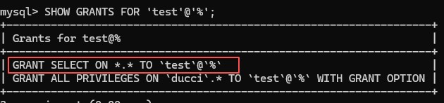 -- 1. 查询当前权限以评估 SHOW GRANTS FOR 'test'@'%'; -- 2. 移除不必要的全局权限,例如: REVOKE SELECT ON *.* FROM 'test'@'%';