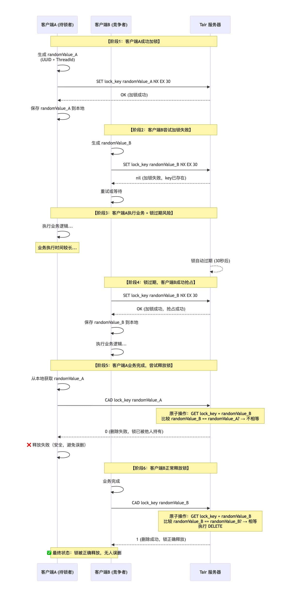 一个完整的 Tair 分布式锁使用流程如下,解锁部分展示了 CAD 命令的用法: