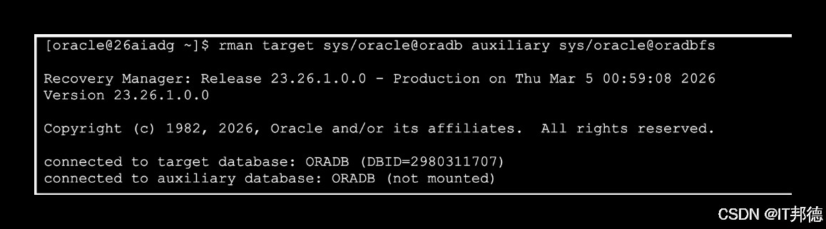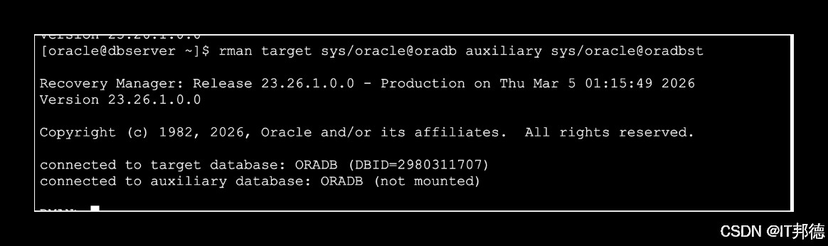 rman target sys/oracle@oradb auxiliary sys/oracle@oradbst