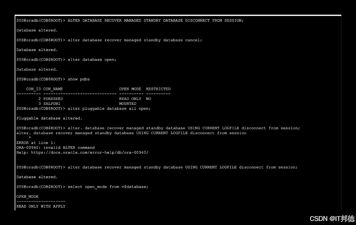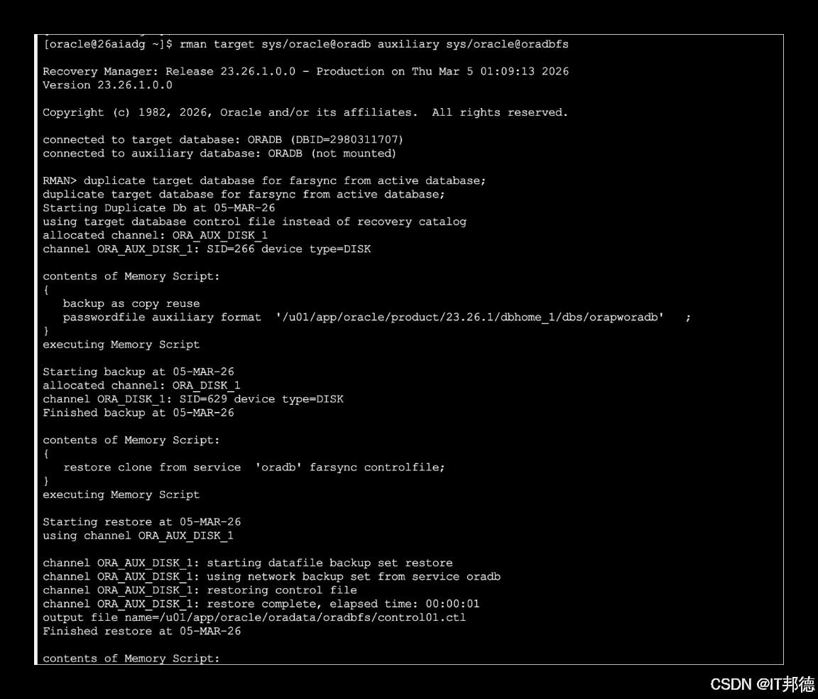 create spfile from pfile='/home/oracle/pfile.init'; 将上面的控制文件和参数文件和密码文件复制到Far Sync实例所在的服务器。 将控制文件存放在/u01/app/oracle/oradata/oradbfs/control01.ctl scp $ORACLE_HOME/dbs/orapworadb 192.168.2.12:/u01/app/oracle/product/23.26.1/dbhome_1/dbs/ scp $ORACLE_HOME/dbs/orapworadb 192.168.2.11:/u01/app/oracle/product/23.26.1/db_1/dbs/dbs