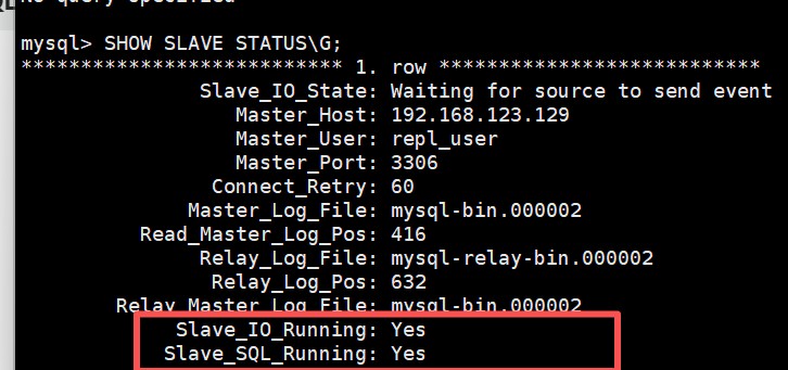 CHANGE REPLICATION SOURCE TO SOURCE_HOST = '192.168.123.129', #主节点配置ip SOURCE_USER = 'repl_user', #主节点创建的用户 SOURCE_PASSWORD = 'Fe216474@', #主节点创建的密码 SOURCE_AUTO_POSITION = 1;