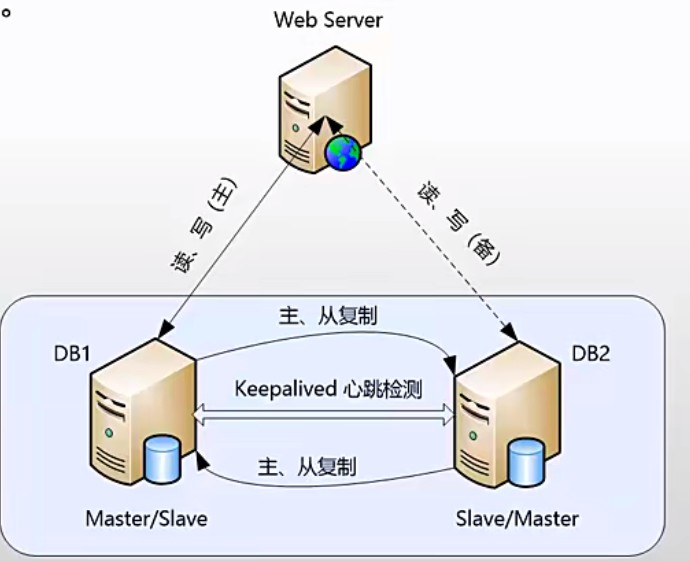 主要设计思路是通过MySQL Replication技术将两台MySQL Server互相将对方作为自己的Master,自己又同时作为对方的Slave来进行复制。这样就实现了高可用构架中的数据同步功能,同时,将采用KeepAlived来实现Mysql的自动failovero在这个构架中,虽然两台MySQL Server互为主从,但同一时刻只有一个MySQL Server可读写,另一个MysQL Server只能进行读操作,这样可保证数据的一致性。