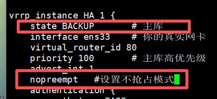 - keepalive.conf配置文件都改为BACKUP,然后加上nopreempt