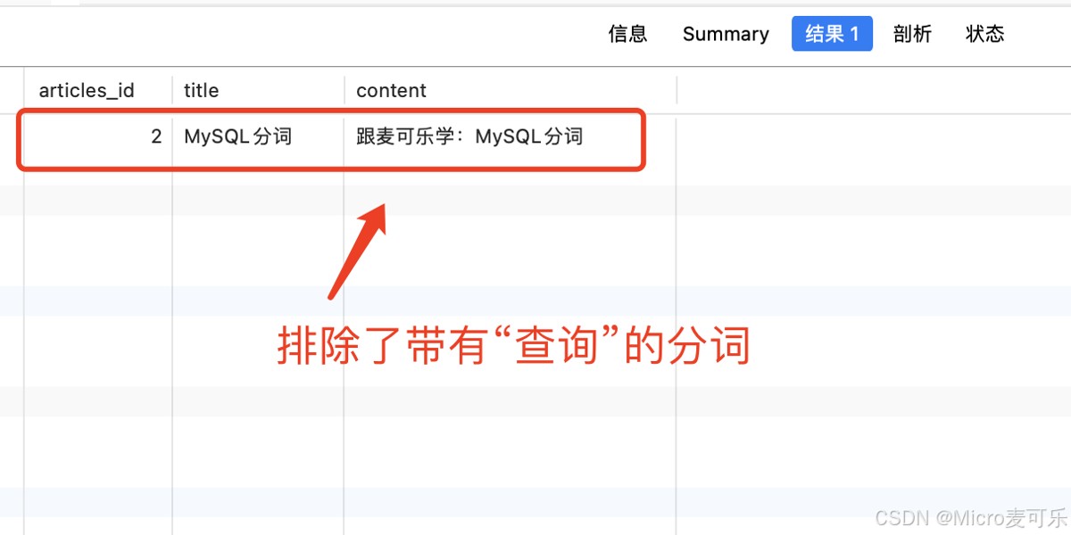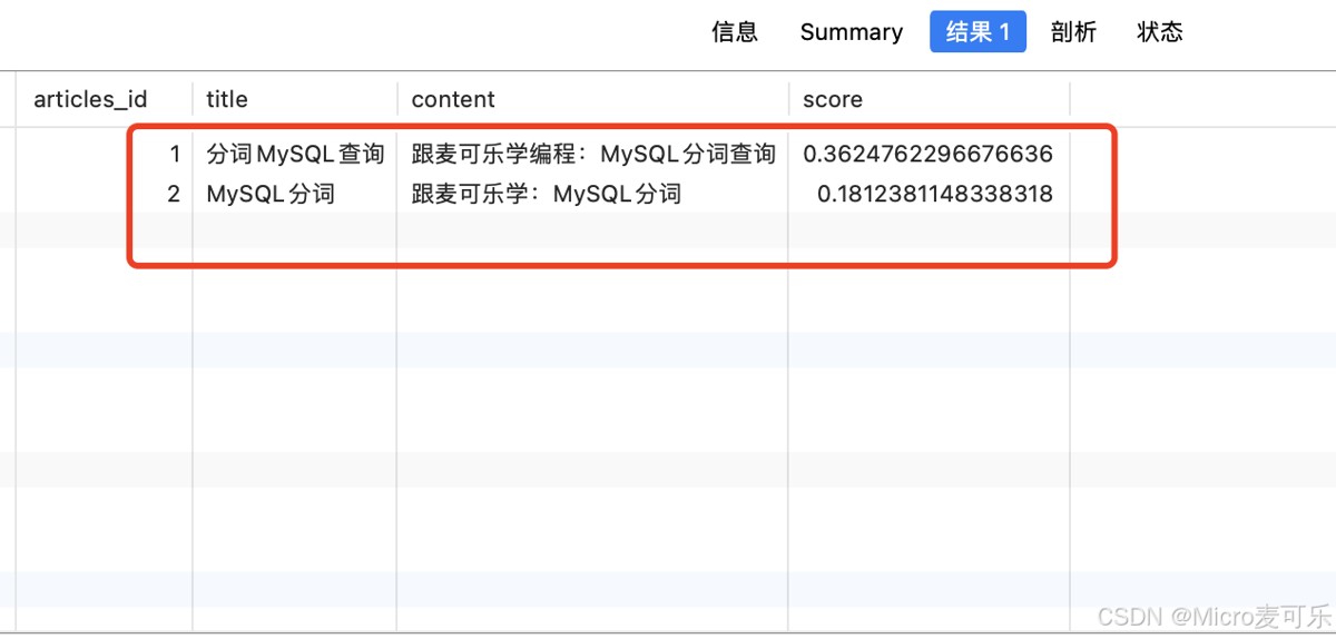 CREATE TABLE `articles` ( `articles_id` int NOT NULL AUTO_INCREMENT COMMENT '文章ID', `title` varchar(255) DEFAULT NULL COMMENT '文章标题', `content` text COMMENT '文章内容', PRIMARY KEY (`articles_id`) ) ENGINE=InnoDB AUTO_INCREMENT=3 DEFAULT CHARSET=utf8mb4 COLLATE=utf8mb4_0900_ai_ci; INSERT INTO `articles` (`articles_id`, `title`, `content`) VALUES (1, '分词MySQL查询', '跟麦可乐学编程:MySQL分词查询'); INSERT INTO `articles` (`articles_id`, `title`, `content`) VALUES (2, 'MySQL分词', '跟麦可乐学:MySQL分词');