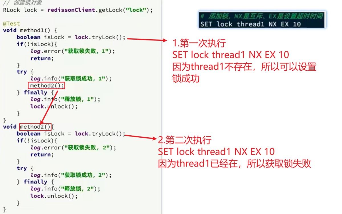 - 同一把锁的名字必须一致:相当于网吧里“1号机器”的锁,你开机用了1号机(拿锁),中途去厕所回来,还想坐1号机(重入锁),必须找的是“1号机”的锁,不能找“2号机”的锁——对应代码里,methodA和methodB用的LOCK_NAME,必须都是“myLock”,不能一个写“myLock”、一个写“myLock1”,否则不是同一把锁,没法重入。