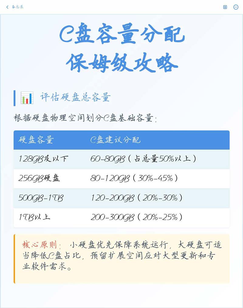 128GB及以下的硬盘,建议给C盘60到80GB,至少得占总量一半以上。256GB的硬盘,C盘分80到120GB比较合适,大概是总量的30%到45%。500GB到1TB的硬盘,120到200GB够用,占比控制在20%到30%。超过1TB的硬盘,给C盘200到300GB就行,保持20%到25%的比例。