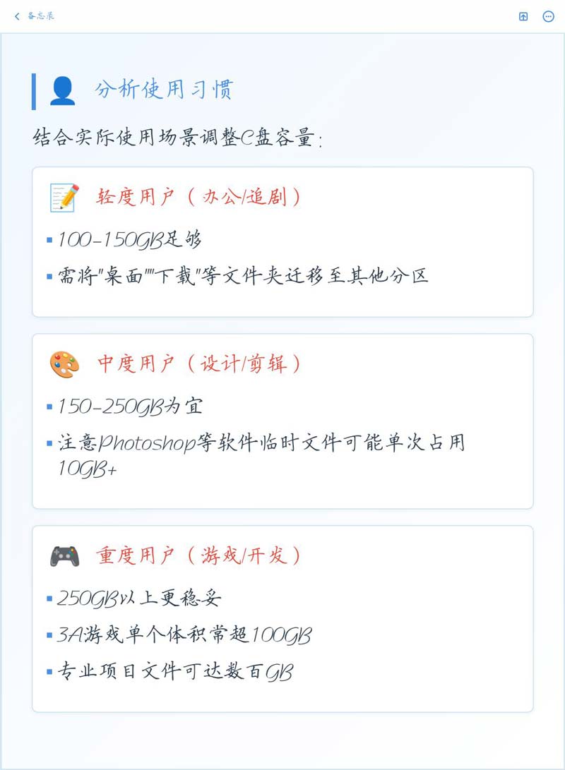 要是只办公追剧,100到150GB完全够用,记得把桌面和下载文件夹移到其他分区。做设计剪辑的中度用户,150到250GB更稳妥,像Photoshop这类软件,临时文件可能一次就占10GB以上。玩游戏搞开发的,最好给C盘250GB以上,现在大型游戏单个就超100GB,项目文件更是能占几百GB。