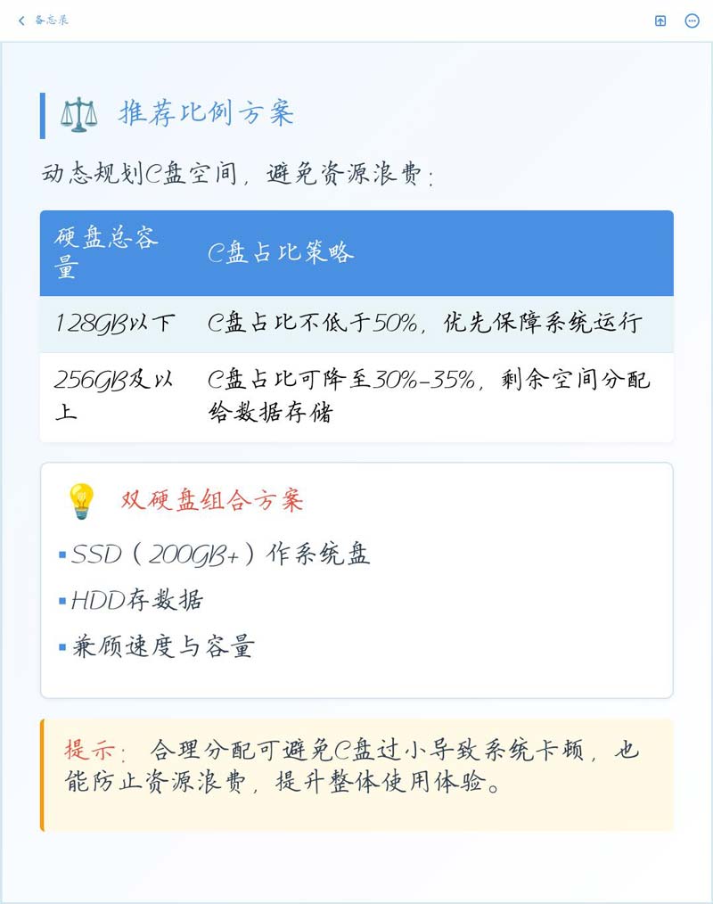 128GB以下的小硬盘,系统盘至少要留一半空间。256GB以上的可以降到30%到35%,剩下的给其他分区。如果是固态加机械的组合,建议用200GB以上的SSD做系统盘,数据存HDD,这样速度和容量都能兼顾。