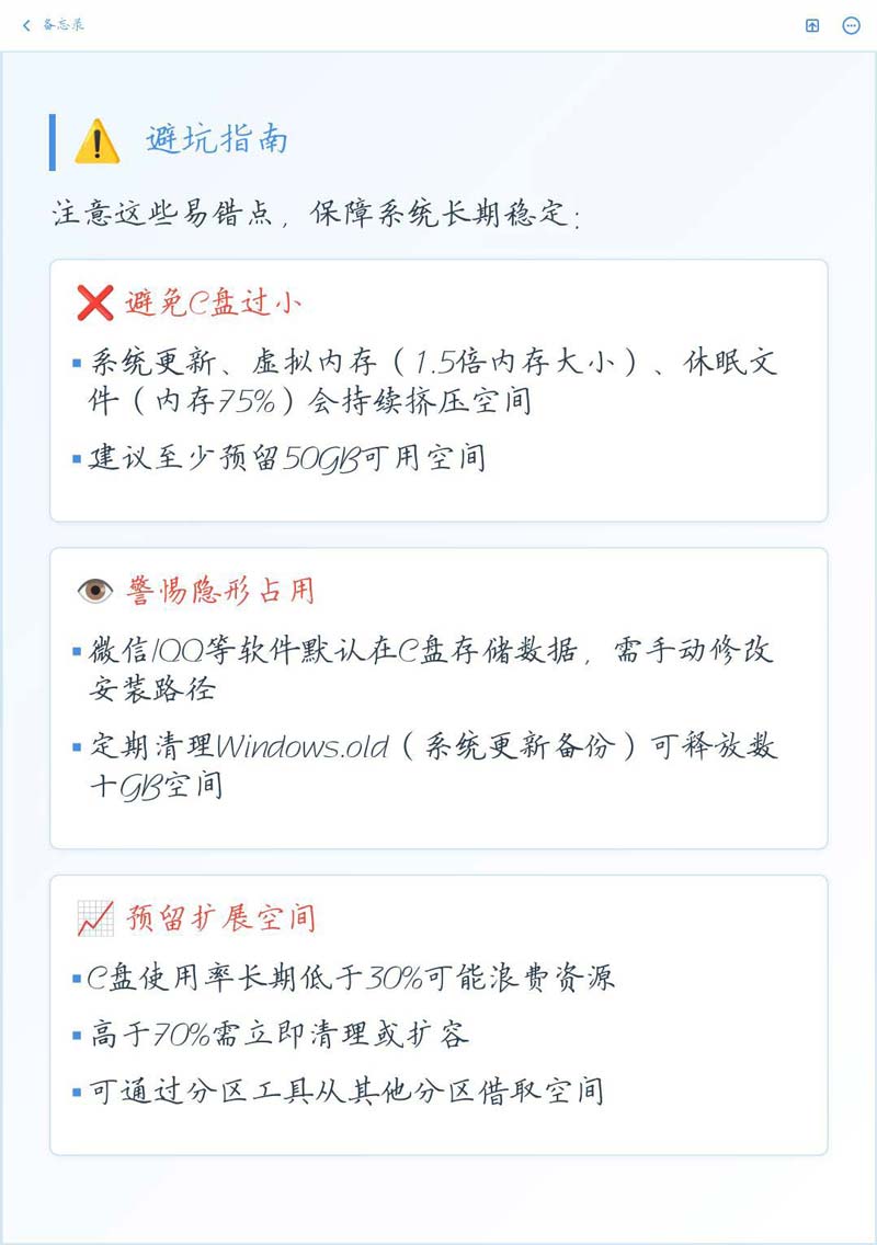 C盘承载了整个电脑的重要功能。如果空间太小,不仅系统运行缓慢,还会出现更新失败、蓝屏、卡顿、无法安装软件等问题。