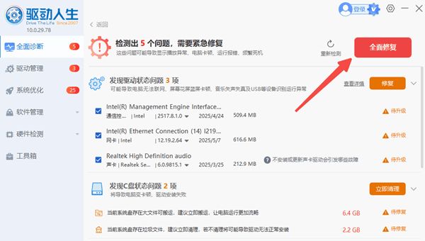 点击“全面修复”,就能一键修复键盘驱动、USB驱动、蓝牙驱动等;