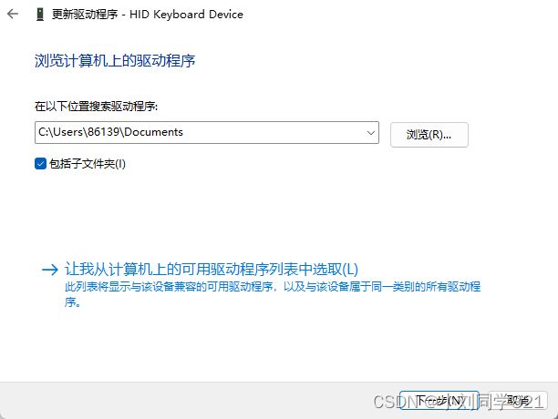 win x 打开设备管理器。右键HID Keyboard Device-更新驱动程序-浏览我的电脑以查找驱动程序-让我从计算机上的可用驱动程序列表中选取-HID compliant device