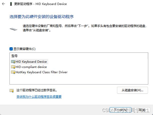 第六步,选择“HID Keyboard Device”,点击“下一步”,如下图所示: