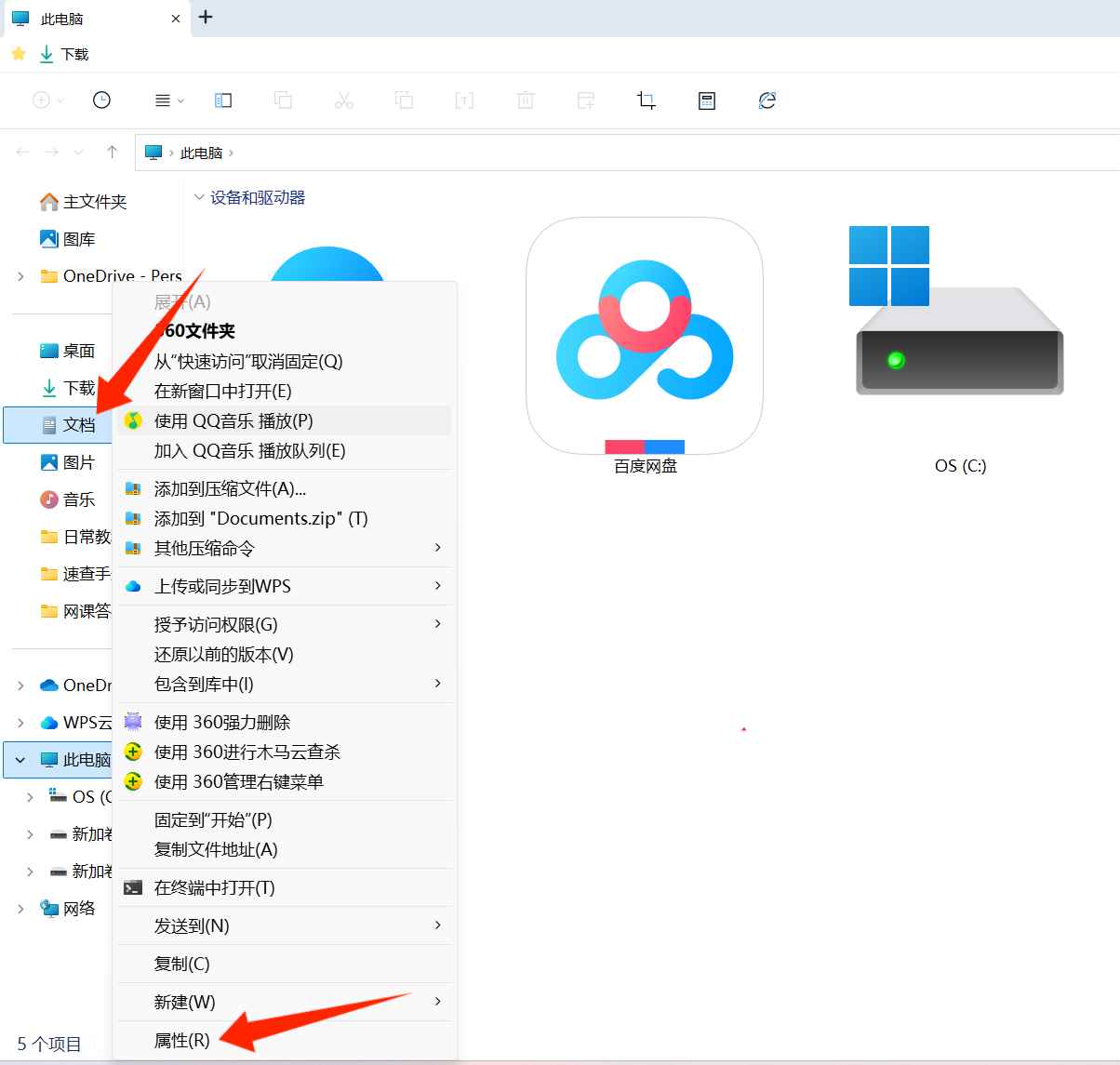 第2步:在打开的窗口中,找到左侧导航栏中的“文档”并右击,在弹出的菜单中选择【属性】。