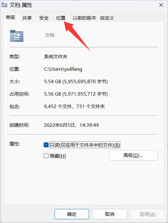 (补充说明:在【常规】标签下可以查看【文档】文件夹当前占用空间。)