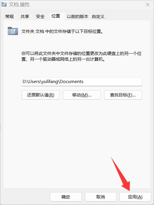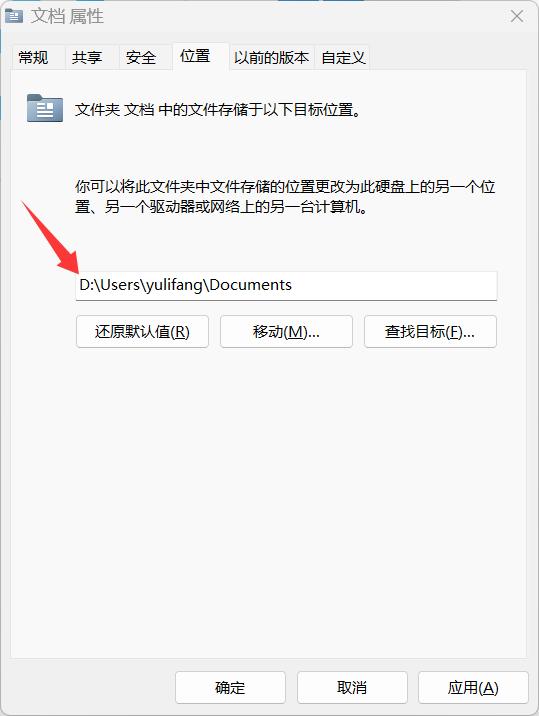 第4步:在【位置】标签下,将【文档】文件夹默认路径开头的【C:】改为【D:】(也可按需选择其他非系统盘符)。