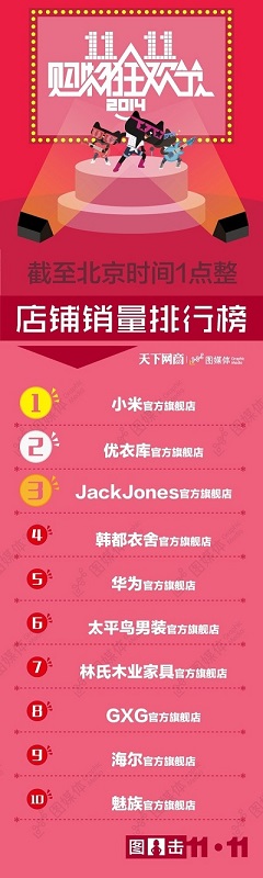 2014双11狂欢节一小时单店销售Top10:小米第一 魅族第十