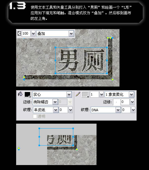 使用文本工具和矢量工具分别打入“男厕”和绘画一个“L形”