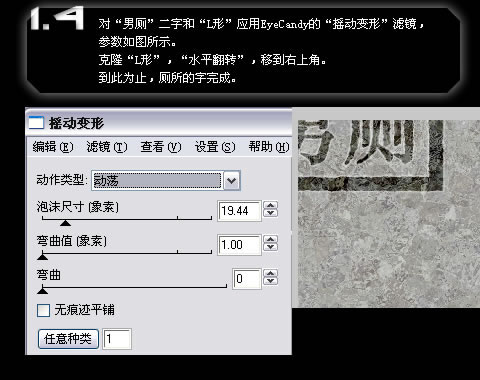 对“男厕”二字和“L形”应用EyeCandy的“摇动变形”滤镜,参数如图所示。