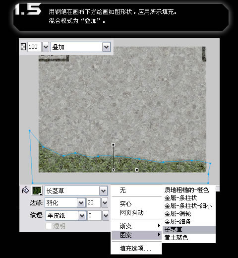 用钢笔在画布下方绘画如图形状,应用所示填充。混合模式为“叠加”。