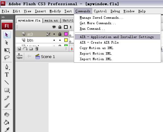 到现在我们的窗体还会显示标题栏,的以我们还要对窗体进行地一下配置,选择Commands->AIR -Application and Istaller Settings,如下图所示: