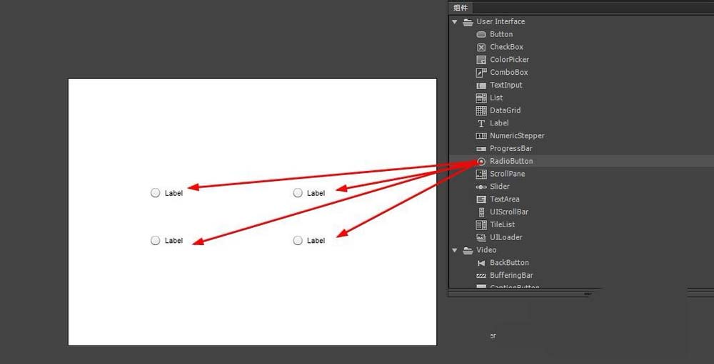 2、ctrl+f7打开组件面板,并拖动四个RadioButton组件到舞台中。
