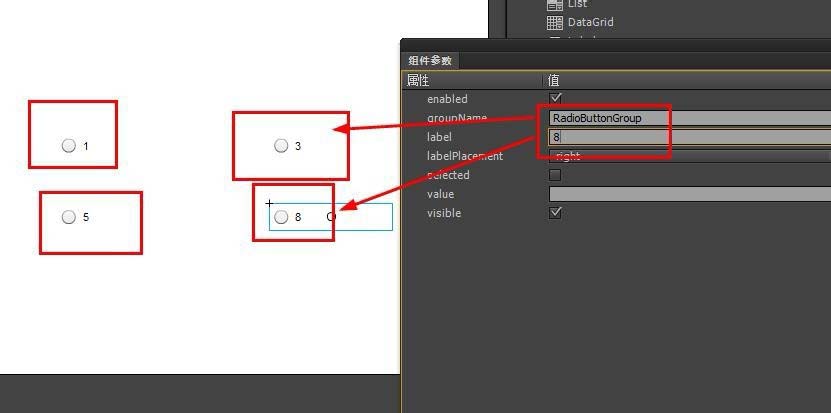 3、依次选择四个组件,设置参数中Label为1,3,5,8