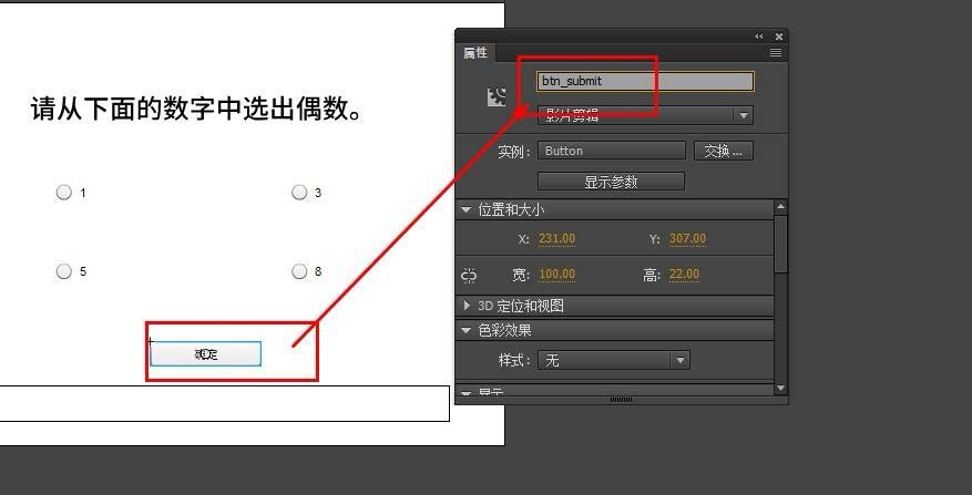 6、从组件面板中拖出一个Button做为确定答案的按钮。设置实例名为btn_sumbit,设置Label参数为确定。