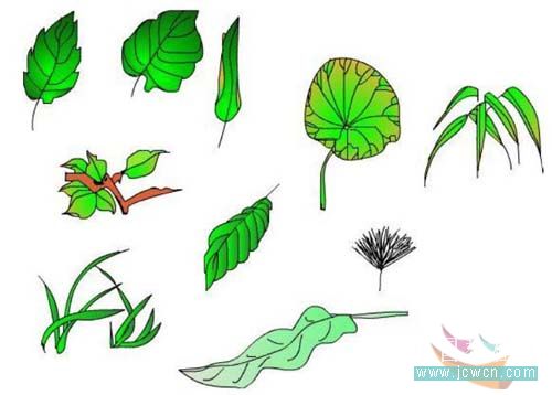 (4)可以封套,任意调整形状。 你只要画出一片叶子,就可以调整出许许多多的形状。 3、套索工具 选中套索工具,就会看到它的选项,其中,魔术棒的功能是选择区域删除,魔术棒属性可以设置选区的阀值等。采用多边形模式可以任意选定区域。它能象铅笔工具那样任意弯弯曲曲去画出选区,也可以象直线工具那样笔直的画出选区。所以,当两个画面相交的比较近的时候,我们要选定一个对象,用选择工具(黑箭头工具)就不方便了,用套索工具就变得非常容易。所以,做不规则选取的时候你还就必须考虑套索工具,你可以对选定区域填色,也可以删除选定区域,用套索工具个叶子做一个虫眼吧,试试分别用“选定—填充”、“选定—删除”两种方法制造一个虫眼。 橡皮工具和文字工具,就不用介绍了吧?不过,橡皮工具的选项还是应该看一看熟悉熟悉。 总之,学习鼠绘必须熟练掌握工具,提高造型能力。在运用调色器的过程中提高色彩知识,只有这样,你的鼠绘作品才能做到形、色俱佳。这些都需要一个坚持下去的过程,我们从下一节课开始,通过一些小实例逐步带领大家熟悉各种工具,熟悉调色器。 #p# 练习: 1、继续完成课堂上的用各种工具绘制叶子的练习。练习通过各种工具的配合使用,绘制出需要的图形。 2、用不同的渐变色对叶子进行填充,同时运用填充变形工具对颜色进行调整。(不一定用绿色渐变,秋天的叶子也会象花一样绚丽啊。) 3、继续完成课堂上的用各种工具绘制鱼的练习。练习通过各种工具的配合使用,绘制出需要的图形。