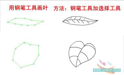 4、钢笔工具: 它不如其他工具使用起来得心应手,但是,它也有其他工具不能替代的功能。它使用节点的连接绘制图形。所以,我们也可以用它增加节点达到调整图形的目的。这些,都需要我们通过反复练习才能掌握,不熟悉的时候,总感到这些工具太欺生,怎么就是用不好呢,那是你还没有掌握这些工具的习性。这可不是听一两节课就能掌握的,你要多练习。下面我们一起用钢笔工具绘制一片树叶。