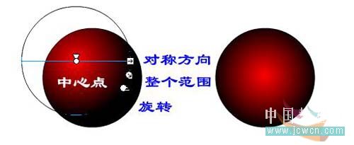 (2)放射渐变的调整: ①点中心的小圆可以拖动中心点的位置。 ②边上有 3 个可调节手柄:小方框里带箭头的调整对称单方向,半圆里带个小箭头的调整整个范围,圆手柄可以旋转。如下图