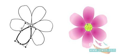 (1)图层1(改名为“花”)图层,用椭圆工具,笔触颜色随意,填充色禁止,画一椭圆。用选择工具调整成花辨状,再用任意变形工具选中花辨把注册点移至下端,在变形面版上约束打勾,旋转60 度,复制并变形5 次,再用放射性填充:左色标 #CC338F,右色标 #F9CAE2,分别为 6 个花辨填充,并用填充变形工具调整,删除边线,如图所示。