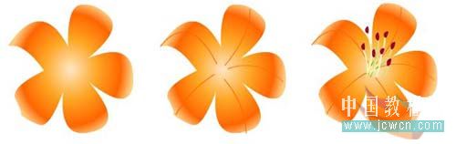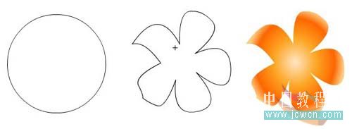 (1)图层1(改名为“花”)图层,用椭圆工具,笔触颜色随意,填充色禁止,画一120*120正圆。按下"ALT"键在圆周上打五个节点,然后用黑箭头工具调整成花瓣形状。填充放射状颜色,从左到右排列色码:#FFE7C4 #FFCC66 #FF6600 #FFCC66。如图所示: