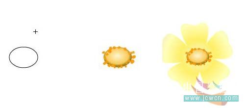 (2)新建图层2(改名为“花蕊”)图层, 用椭圆工具,笔触颜色随意,画一29*21椭圆, 填充放射状颜色,从左到右排列色码:#FCF8CF #FBCA59 #9D8215,填充后删除笔触,用刷子工具点上花蕊,色码为:#FF9900。如图所示: