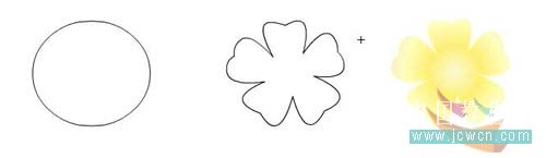 (1)图层1(改名为“花”)图层,用椭圆工具,笔触颜色随意,填充色禁止,画一95*85椭圆。按下"ALT"键在圆周上打五个节点,然后用黑箭头工具调整成花瓣形状。填充放射状颜色,从左到右排列色码:#FCF8CF #FEEF67 #FFFFBB #F8EDC2,填充后删除笔触。如图所示: