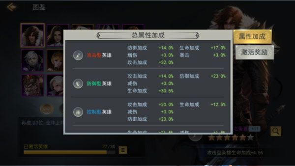 在图鉴界面中,玩家可以看到游戏中所有英雄的收集情况。在图鉴中激活各位英雄会为队伍带来不同的属性加成(获取即可激活,无需上阵该英雄)。