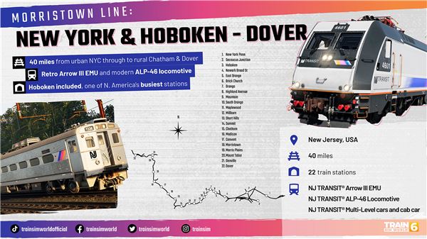 在莫里斯敦线上领略新泽西交通公司®的电气化铁路网络。穿过莫里斯和埃塞克斯郡的郊区,乘坐经典的 Arrow III 型电力动车组、ALP-46 型机车和多层车厢列车穿梭于纽约市和通勤小镇多佛之间。