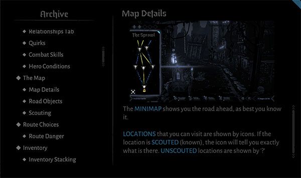 小地图展示了据你所知你的道路前面有什么,你可以访问的地点会通过标记展示,如果这个地点被侦察过了,标志会展现出它到底是什么东西,如果没有被侦察的话,会显示出一个?