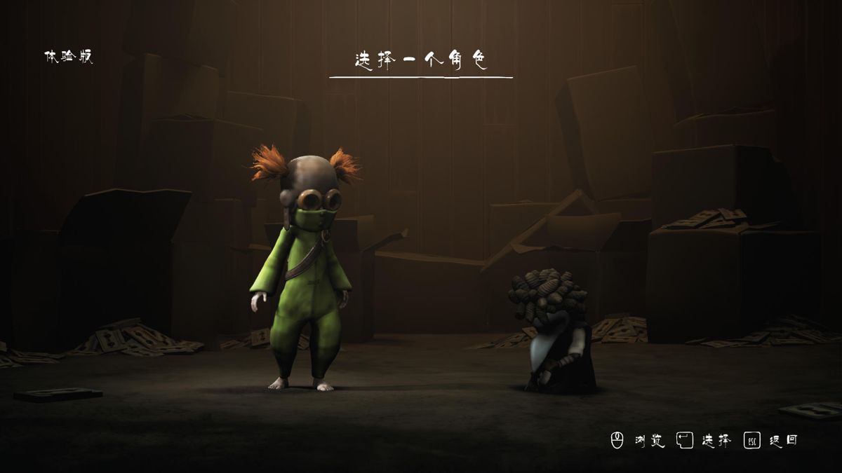 游戏开始前玩家可以在“小洛”和“小寂”这两个角色中任选其一。小洛是个戴着乌鸦面具的小男孩,手握弓箭;小寂则是扎着双马尾的女孩,拿着一把巨大的扳手。跑动、冲刺、下蹲是基础移动操作,下蹲时还能移动来躲避敌人的视线。抓取键按住后,可以实现抓取物品、攀住物体边缘或者攀爬梯子等动作。武器操作需要先按一次按键掏出武器,之后才能使用。在掏出武器的情况下,就无法进行抓取或攀爬等动作了。小洛的弓箭能自动瞄准,可用来射击道具或互动元素;小寂的扳手则可以砸开墙壁或者拧在螺母上当作杠杆使用。
