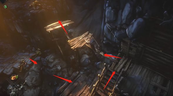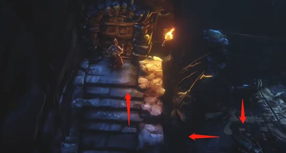 4、捡完之后跳下来,朝着右侧走,然后再顺着箭头指引朝着左上面去。