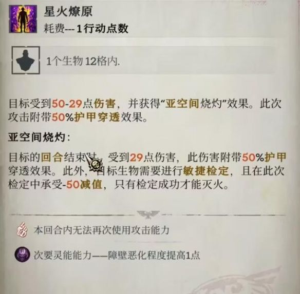 火灵能攻击能力有12格的攻击范围,不吃暴击伤害乘区,吃百分比修正值伤害乘区,近战火灵能在实战中总会有敌人站的很开,导致很多时候移动点数用完而攻击次数没用完,这时就可以用火灵能能力进行远程输出。