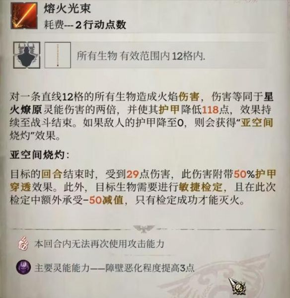 最好用的火灵能能力。伤害是星火燎原灵能伤害的两倍,但攻击距离长(12格),攻击范围大(直线12格所有生物),根据战场中的实际情况可以尽可能地打多。