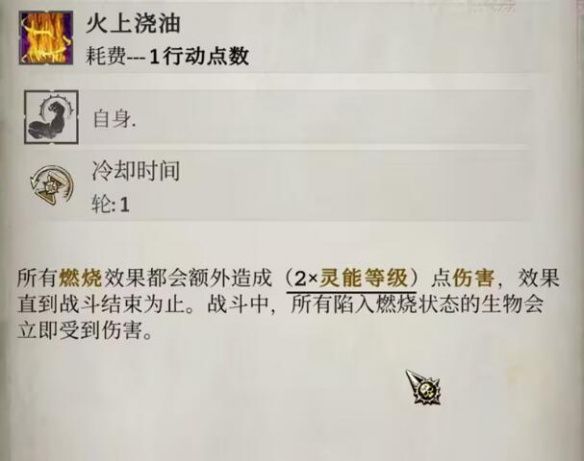 打分散站位的敌人时用。有些时候敌人分隔的很远,那么就可以挂上给副目标挂上燃烧,再对主目标用烈焰焚烧打伤害。