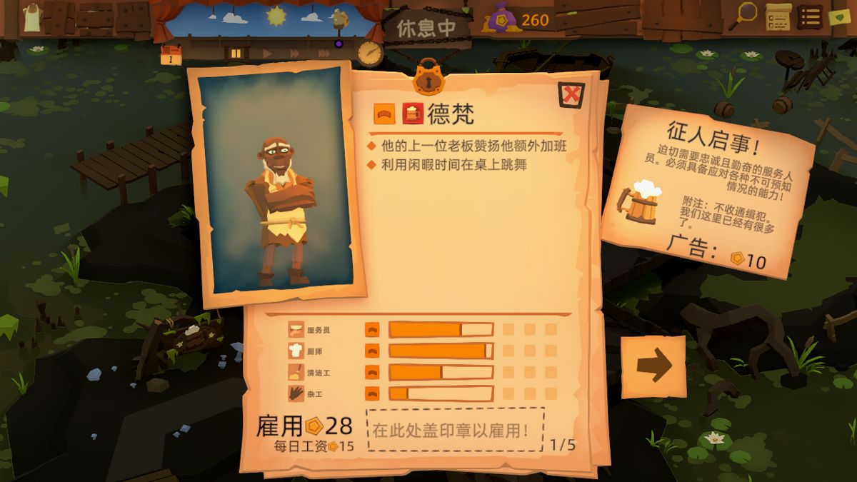经营管理:玩家从接手一个简陋的酒馆开始,通过修建房间、雇佣员工、补充库存,逐步满足顾客的需求,将酒馆做大做强。