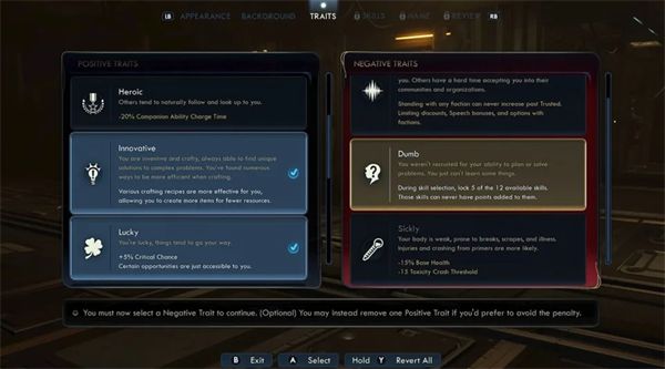 此外还有「特质」,它们能叠加额外的永久效果,这些效果通常无法通过天赋系统获取。关键在于,如果你希望能够选取更多的正面特质效果,那就必然会伴随着负面特质效果,而这正是让玩法变得有意思的地方。我其实很好奇像「笨蛋」这样的特质会如何影响游戏流程,因为选择这项特质就意味着我此后再也无法在十二项技能中的五项里投入点数,又或者选个类似「体弱多病」这样的特质,它会降低我的生命值和毒素抗性。这似乎是一种利弊权衡,至于是否值得,主要取决于我想如何塑造自己的角色。
