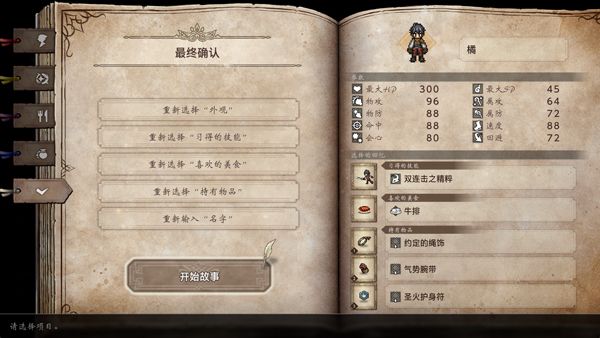 2、设置好后点击开始新游戏,然后创建一个角色,玩家可选择初始技能,以及持有物品,并取个名字;