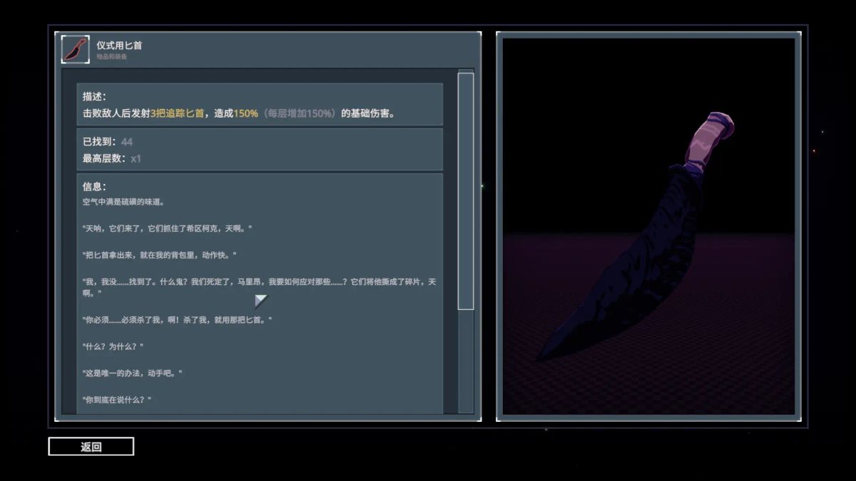 敌人死亡后掉落三把小刀,会自动飞向其他敌人,造成150%伤害,同请原谅我(巫毒 娃娃)是绝配,清小怪很好用,打boss基本无用