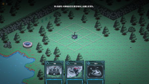 玩家拥有9个核心地块,通过抽取的9张卡牌(建筑、部队、法术)进行布局。每张卡牌代表一种功能,例如资源工坊、兵营或研究所,不同建筑的组合将影响王国发展路径。
