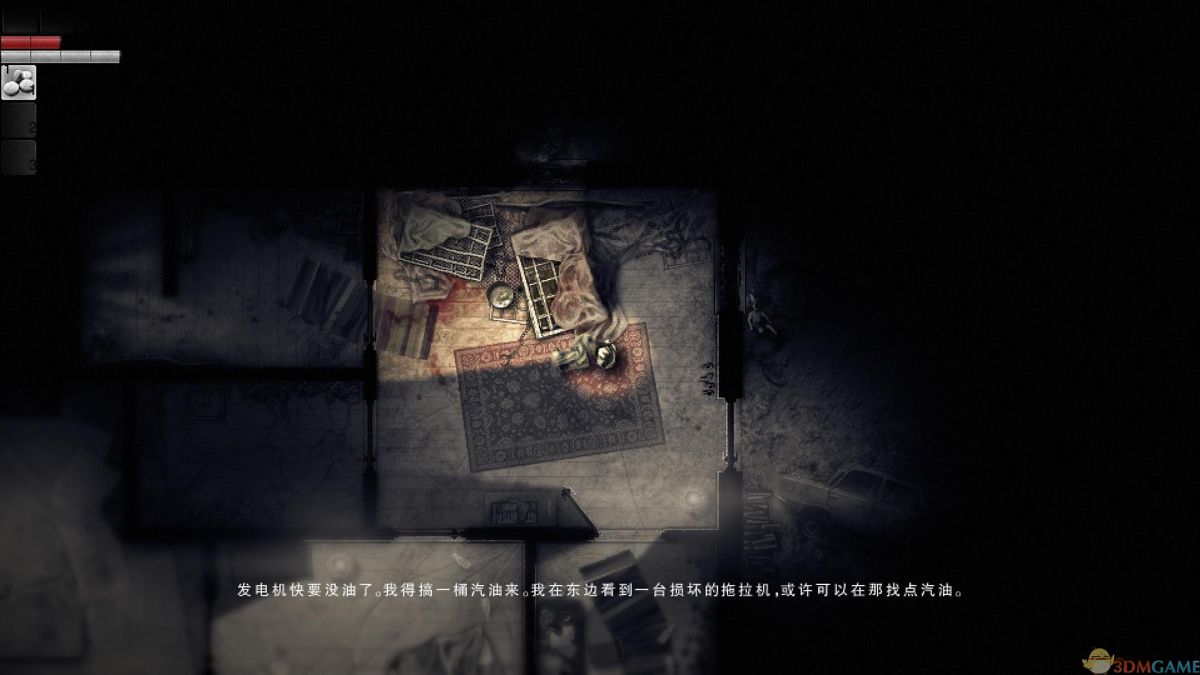 与发电机对话,得知其未能启动,因为它需要汽油(电机房北面的房间宝箱中拾获)来发动。它不单只需要汽油还需要酒(可以在一开始所扮演的秃头男苏醒的房间中拾获)。