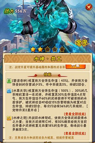 水神出战属性是为前排武将加伤,后排武将减伤,可以说是完美的出战属性,既保证了前排的输出,又减少后排抵挡的伤害。水神为防御宠物,比较适合做副将的护佑,他能更好的让副将在战斗中生存、保证与主将的合击。一个0星满神炼的水神上阵也可以,因为奶量不受战宠攻击力的影响,吞噬的技能加伤对奶量也没有什么影响。