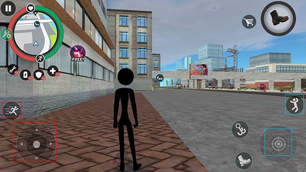 左侧移动、加速,右侧绳索,攻击(跳跃),跳跃,右上侧的武器更换以及血量、经验的显示都实时更新,一览无遗,凭借着大家自由的玩法,与其他帮派的人物进行交火,期间杀敌人能够获得经验,杀多了会产生星级,巡警和其他附近角色会特殊照顾你对你展开火热的进攻,而如何存活,如何将其他人物击杀则是你所需要完成的任务。